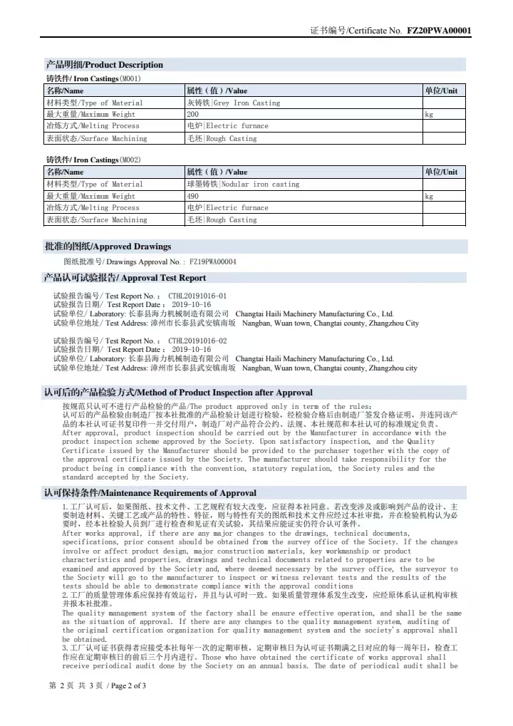 2019年通過法國BV船級社和中國船級社認證;